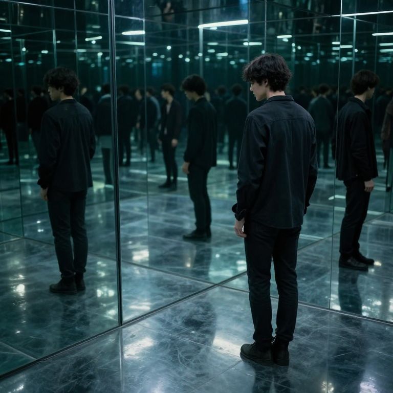 In a labyrinth of mirrored reflections, a solitary figure stands amidst the echoes of infinite selves, each a whisper of possibility, while the cool, damp floor beneath mirrors the weight of introspection and the quiet ache of existential solitude.