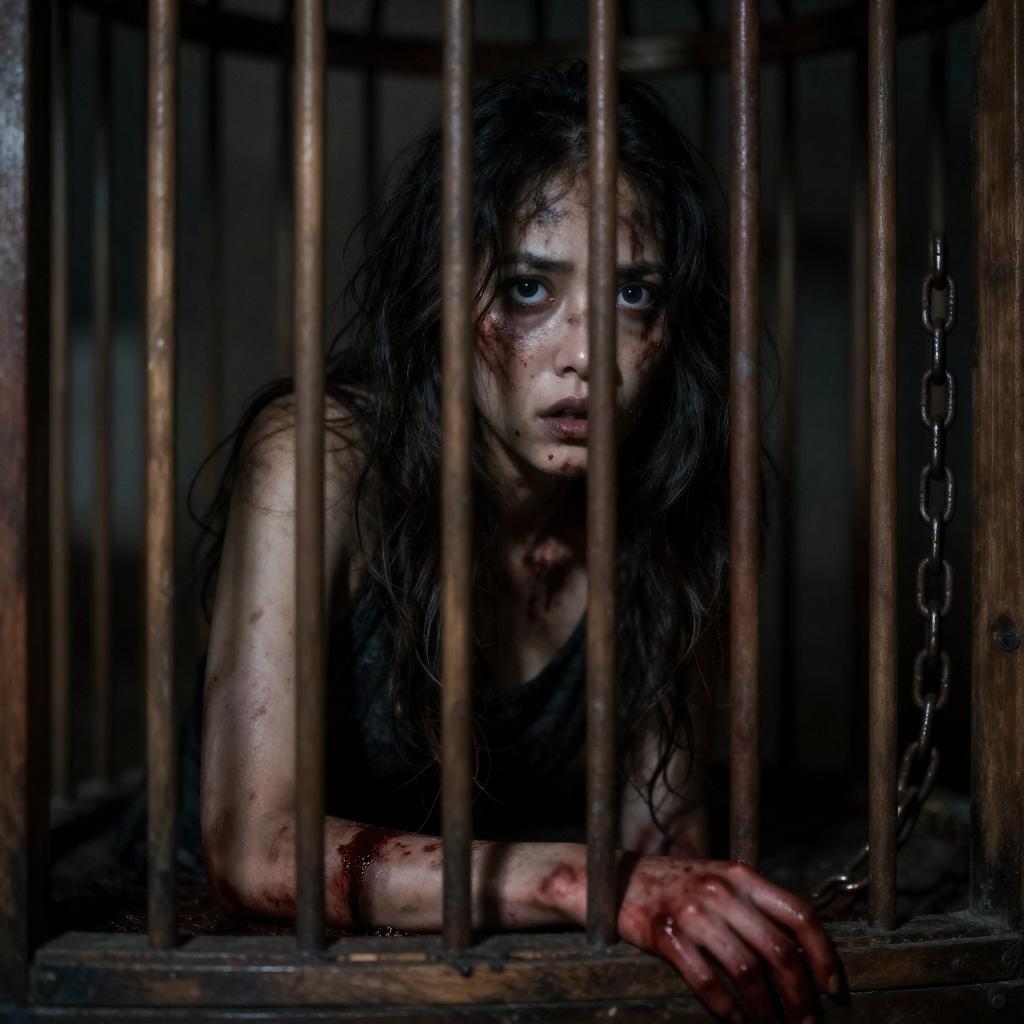 Blood-Streaked Woman in Wooden Cage