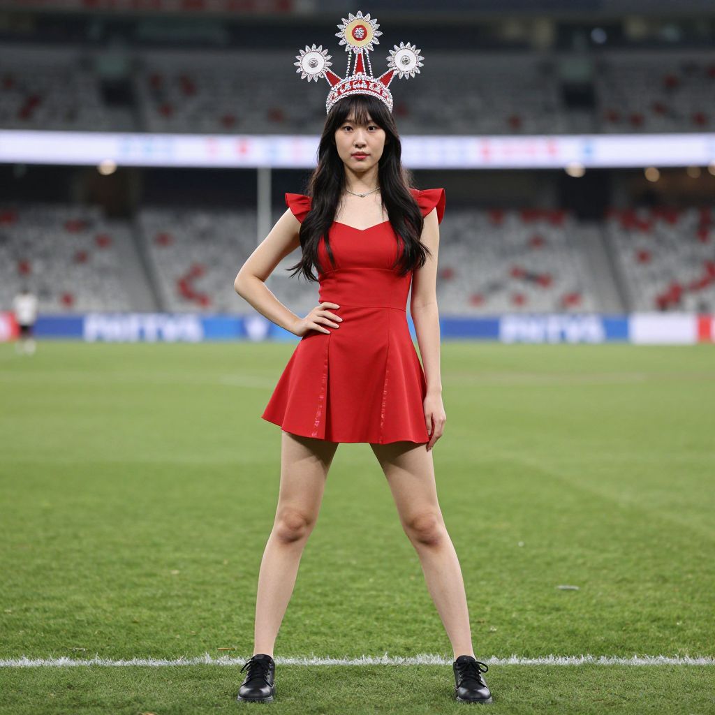 Photograph of an East Asian woman standing confidently on a green football field. She has long, straight black hair and is wearing a bright red, short-sleeved, A-line dress that flares out slightly. She accessorizes with a sparkling, crown-like headpiece with sunburst patterns. Her skin is fair, and she has a slender build. She stands with one hand on her hip and the other relaxed by her side. She wears black sneakers. The background shows a blurred stadium with rows of red and grey seats, and the field's white boundary lines are visible. The overall scene is brightly lit, emphasizing her vibrant dress and crown.