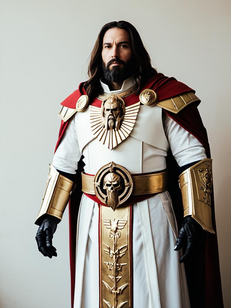 A man with long dark hair and a beard wearing a detailed and realistic cosplay costume of The God Emperor of Mankind from Warhammer 40k. The outfit features white robes with gold ornate armor pieces, a red cape, and black gloves. The costume includes symbolic decorations such as a gold skull belt buckle and intricate chest armor with a face motif.