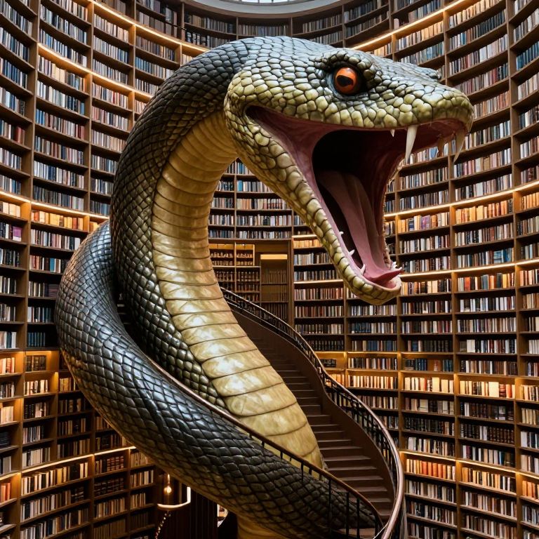 Photorealistic digital artwork depicting a massive, detailed snake with shiny, dark green and yellow scales, its mouth wide open revealing sharp teeth and a pink tongue. The snake's head dominates the foreground, with its body coiling around the center. The background features a grand, circular library with rows of illuminated bookshelves filled with books, creating a warm, golden glow. The library's architecture includes curved walls and a high ceiling, emphasizing the grandeur and vastness of the space. The snake's realistic textures contrast with the smooth, polished surfaces of the bookshelves, adding a sense of surrealism to the scene.