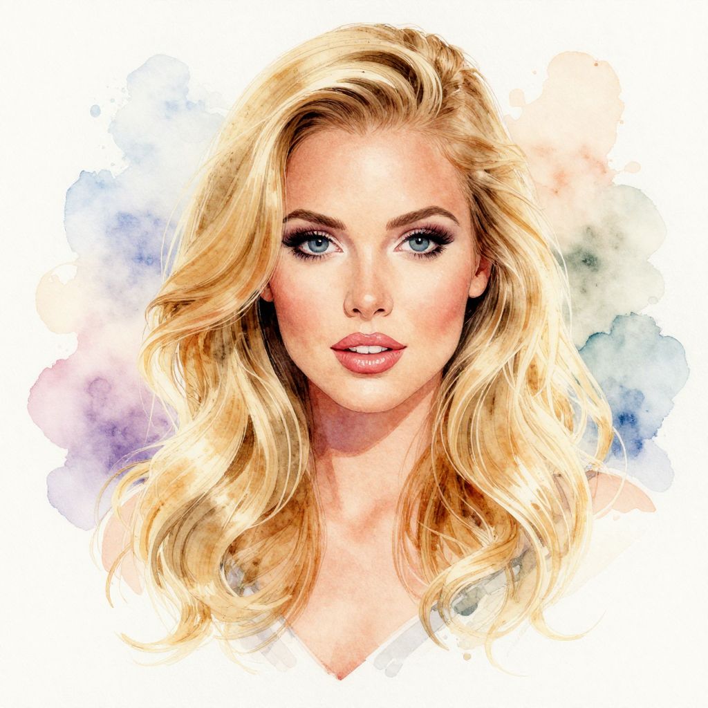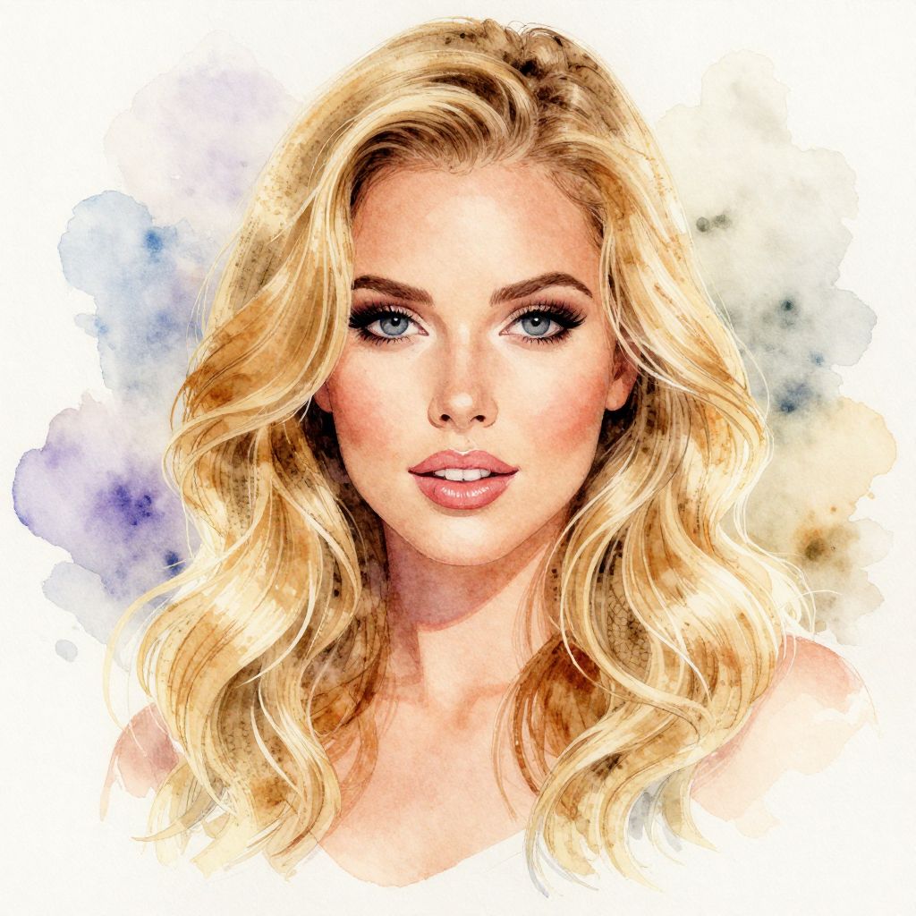 Watercolor-style digital portrait of a blonde woman with wavy hair, blue eyes, and fair skin, set against a soft, abstract background.