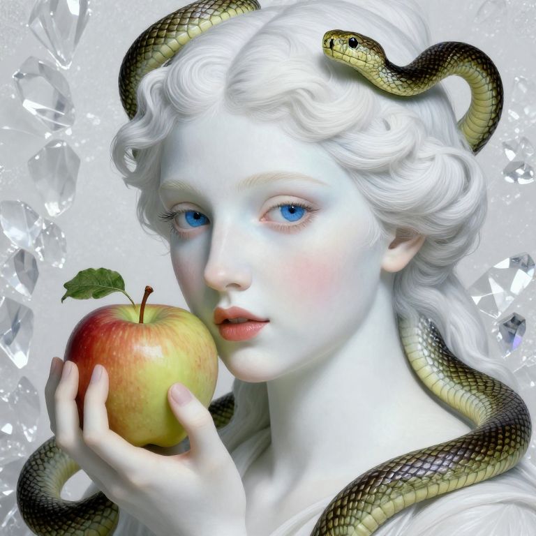 Vincent Van Gogh hyperealistic beautiful face of kind and sensual white godess of love, with blue eyes, with apple and friendly snake, on a white cristal background, 8k,