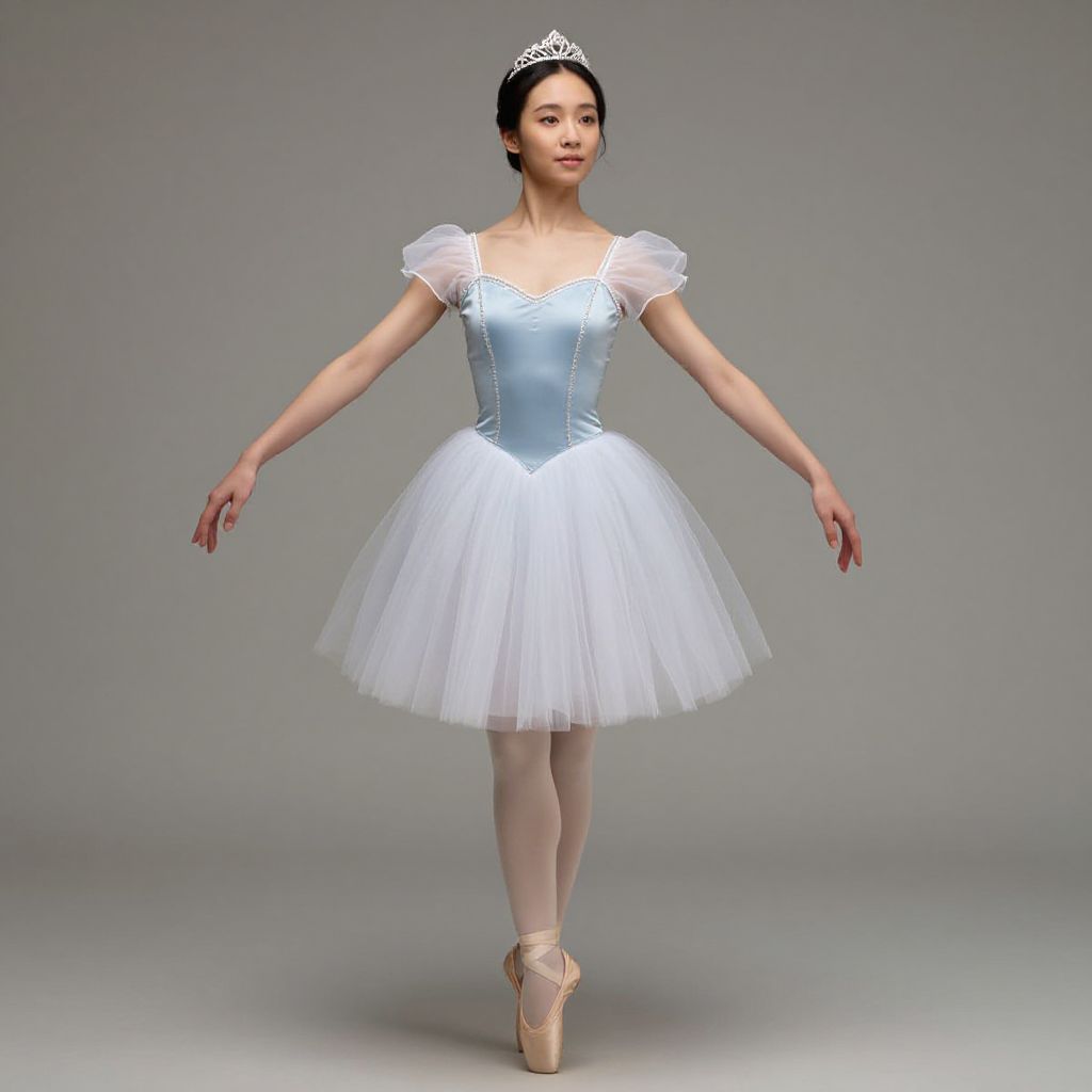 Photograph of an Asian female ballerina with fair skin, black hair in a bun, wearing a blue, long-sleeve, button-up top with white stars on the chest, black high-waisted shorts, white tights, and beige ballet shoes. She stands in a graceful pose, arms extended and slightly bent at the elbows, with one leg crossed over the other. The background is a solid, muted gray, highlighting her elegant dance attire and poised posture. The lighting is soft, emphasizing the smooth texture of her tights and the delicate fabric of her top.
