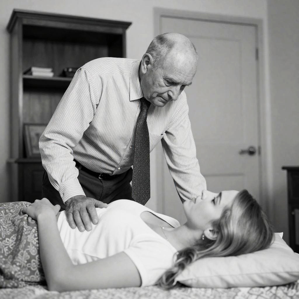 Black-and-white photograph of an elderly bald man in a striped shirt and tie leaning over a young woman with blonde hair, lying on a bed in a patterned room. He looks down at her with a concerned expression, while she gazes up at him, her hand touching his chest. Background includes a wooden cabinet, shelves, and a closed door.