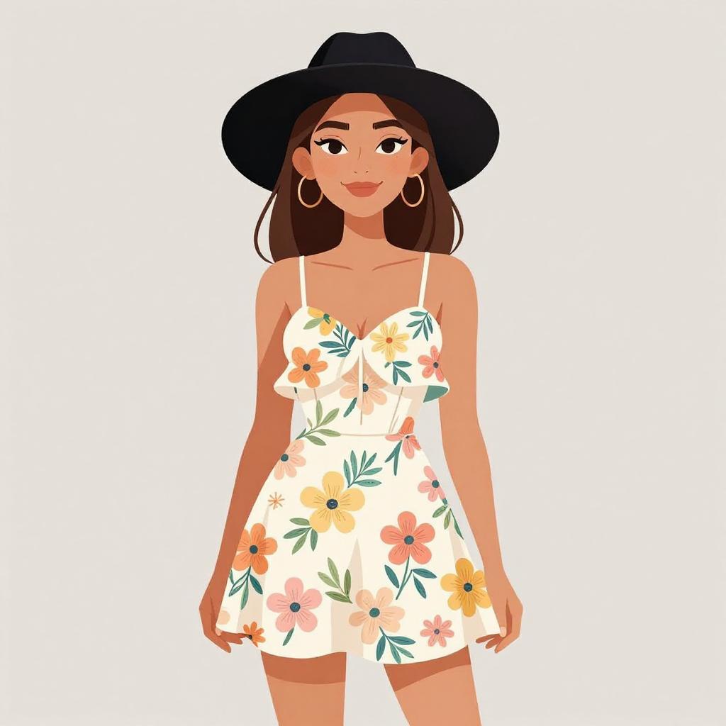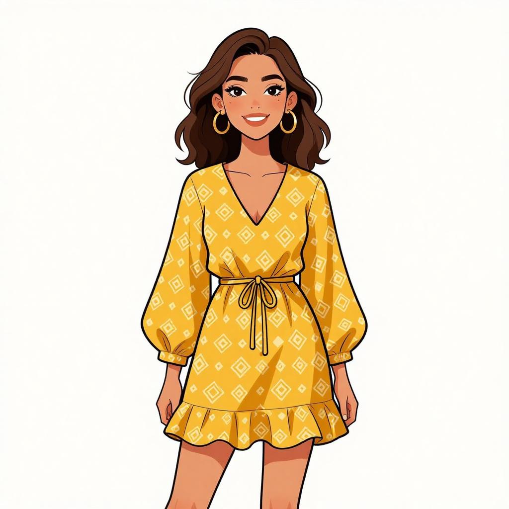 Woman with pretty face and pretty hair. smiling Woman, boho chic, lemon yellow mini dress with lace detailing, square neckline with a tie-front, sheer puff sleeves, delicate floral embroidery, fringe trim at hem, white background. --sref 1467