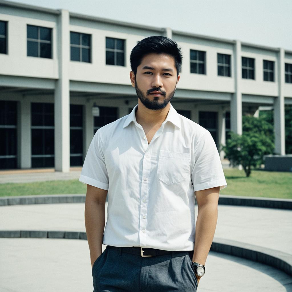 Portrait of an Asian male soccer player standing on a soccer field wearing a green and black soccer uniform with the number 10. He has short black hair and is holding a soccer ball in his left hand, ready to play. The background shows a blurred view of trees and a goalpost.