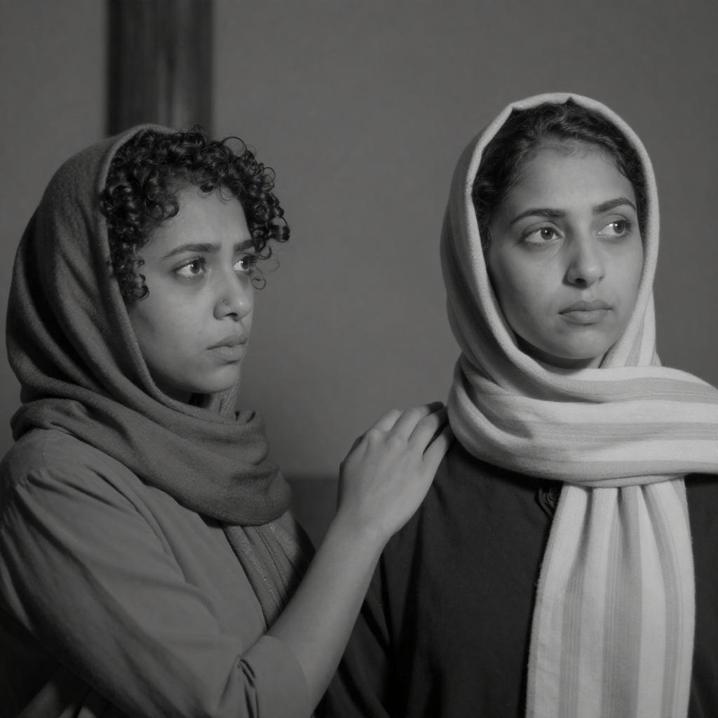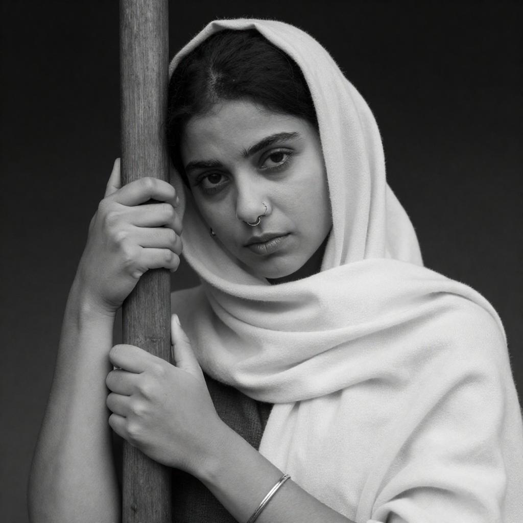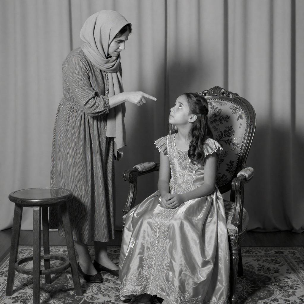 Black and white photograph. Woman in striped dress with headscarf stands, pointing at seated girl in elaborate gown on ornate chair. Floral-patterned chair, patterned rug, draped curtains in background. Girl looks up, slightly shy. Woman's expression intense. Girl's expression curious. Wooden stool with glass on left. Light casts shadows.