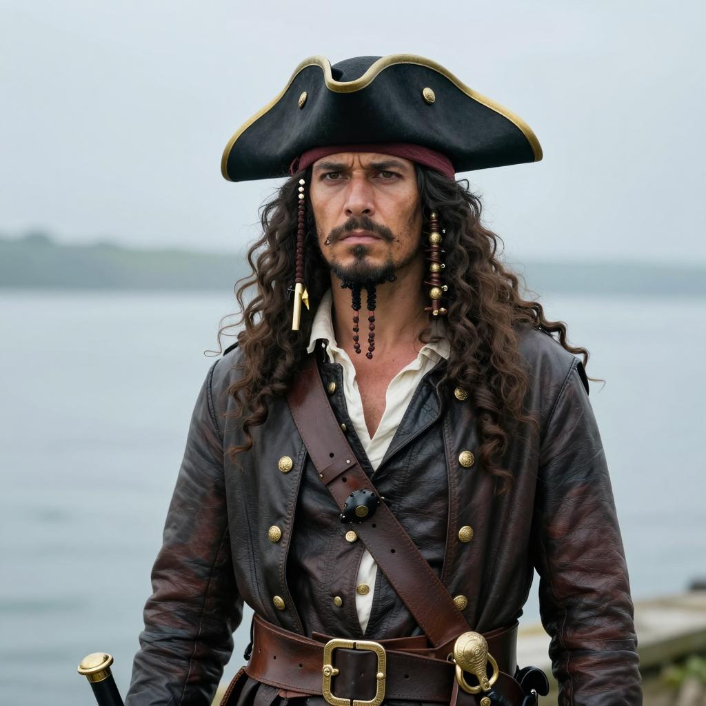 Photorealistic portrait of a man dressed in a sleeveless black pirate costume with gold buttons and striped pants, wearing a black pirate hat with skull and crossbones. The man has dreadlocks, a goatee, and is standing on a sandy beach with the ocean in the background.