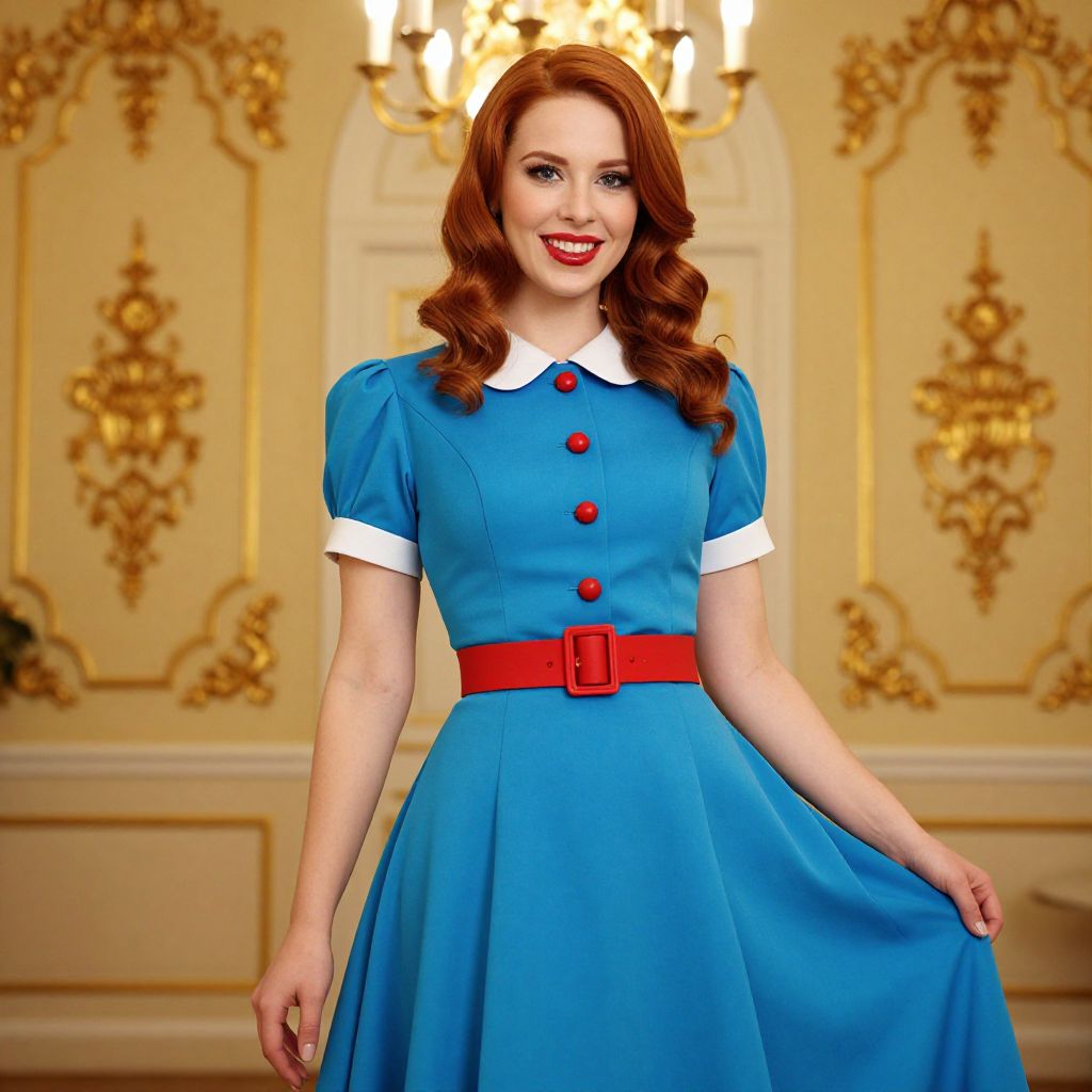 A vibrant, digitally created image of a fair-skinned woman with red, wavy hair. She's wearing a bright blue, vintage-inspired dress with puffed sleeves, a white Peter Pan collar, and red buttons. A red belt accentuates her waist. She's standing in a warmly lit, elegant room with ornate golden wall art and a chandelier in the background. She's smiling and holding her dress slightly to the side.