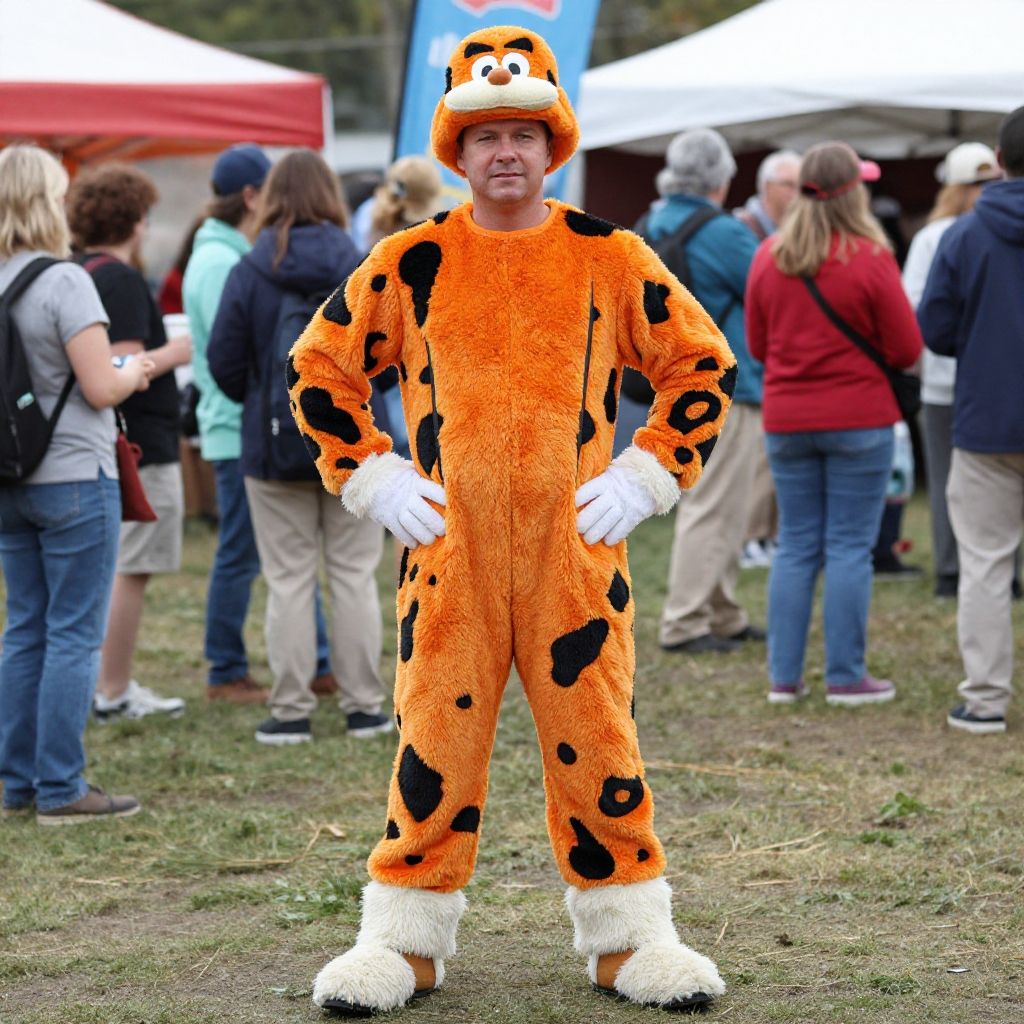 Photograph of a young man standing confidently outdoors at a fair or festival, wearing a full-body, orange, furry costume with black spots resembling a cartoon tiger or dog. He has white gloves and a matching hat with a cute, smiling expression. The background shows a grassy area with several people, some in casual clothing, standing and talking under white and red tents. The image has a slight, vivid color enhancement, making the costume and surroundings more vibrant. The man's hands are on his hips, and he has a neutral expression.