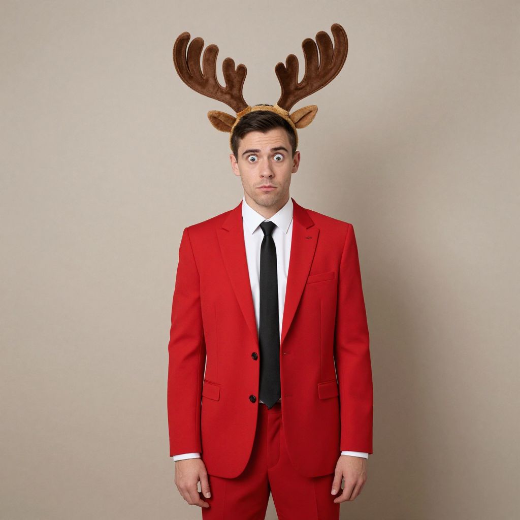 Stag Do Funny Outfit, man in a red suit with antlers on his head