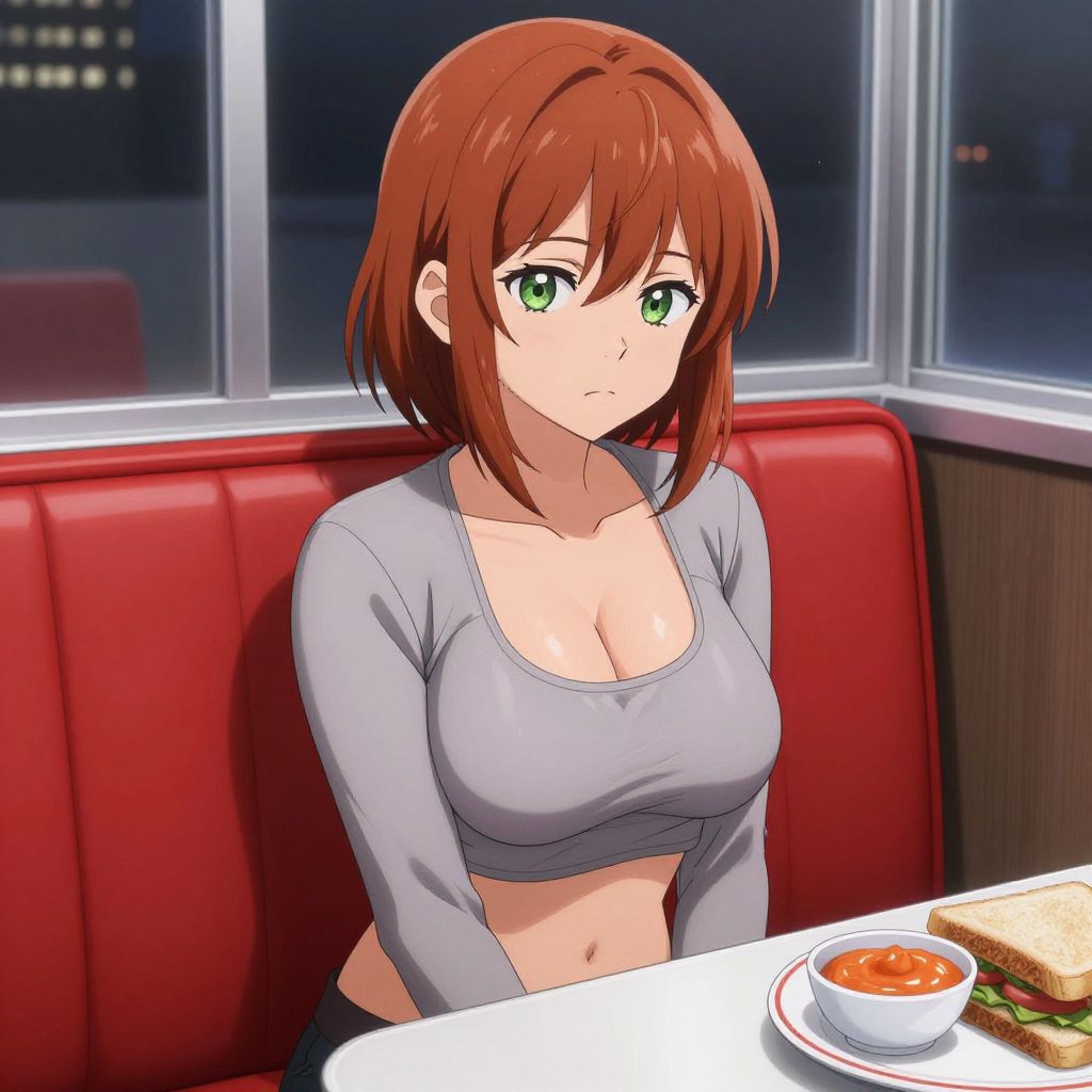 Anime-style digital drawing of a red-haired, green-eyed woman with large breasts in a grey crop top, sitting in a red booth at a diner,
