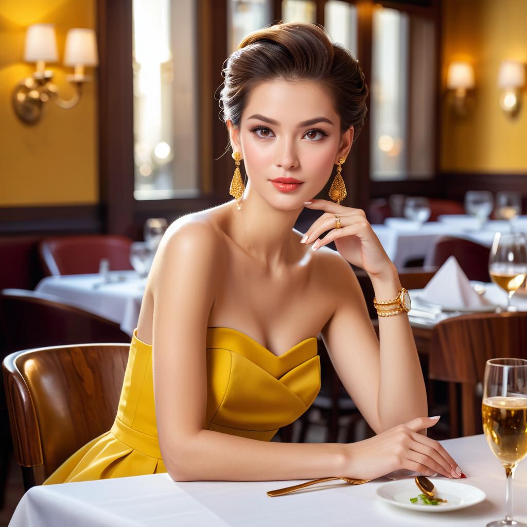 Glamorous young woman with sophisticated hairstyle wearing a yellow strapless dress, gold earrings, a wristwatch, and a ring sits at a restaurant table with a white tablecloth. The cozy indoor setting features wooden chairs, soft warm lighting, and a detailed background of windows and lamps.