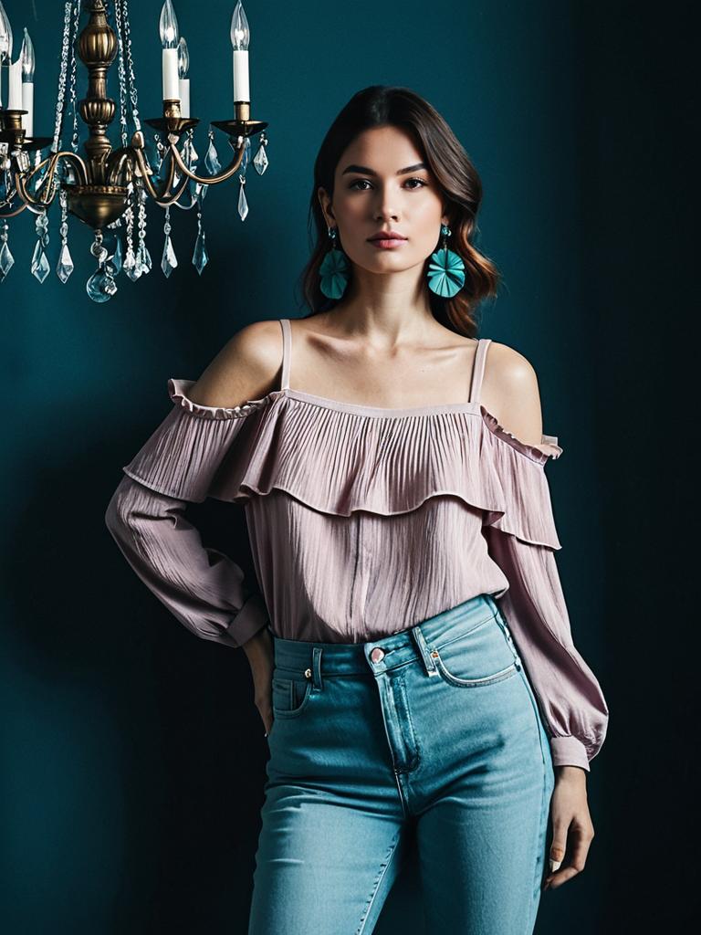 Woman, casual, dusty rose cold-shoulder blouse with ruffle detail, long sleeves, pleated front, light-wash skinny denim jeans, statement turquoise chandelier earrings --sref 1439