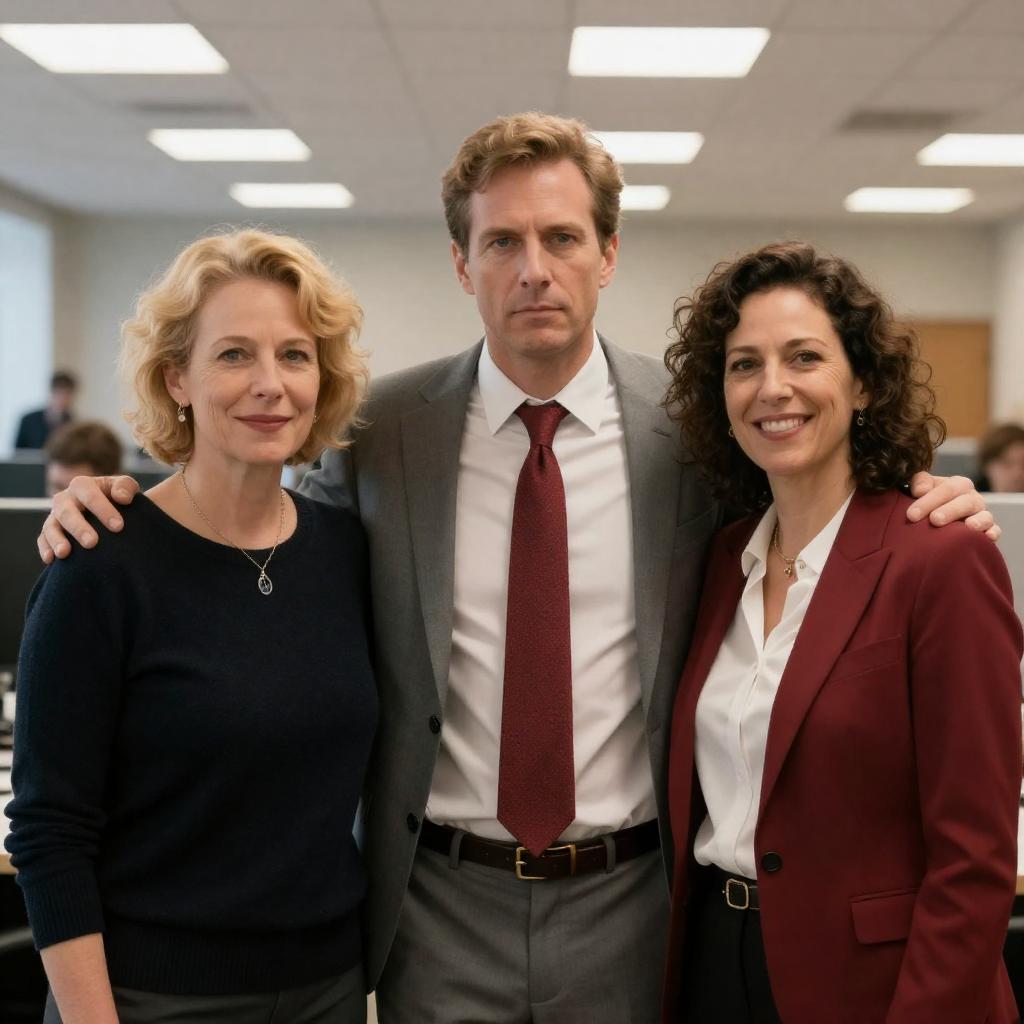 Photograph of three people in an office. Foreground: middle-aged woman with curly brown hair, glasses, red blazer, patterned scarf, smiling, holding papers. Background: two men, one with mustache, dark hair, brown shirt, focused on typewriter, other with beard, plaid shirt, looking down. Typewriter labeled "National Video." Bright lighting, office setting.