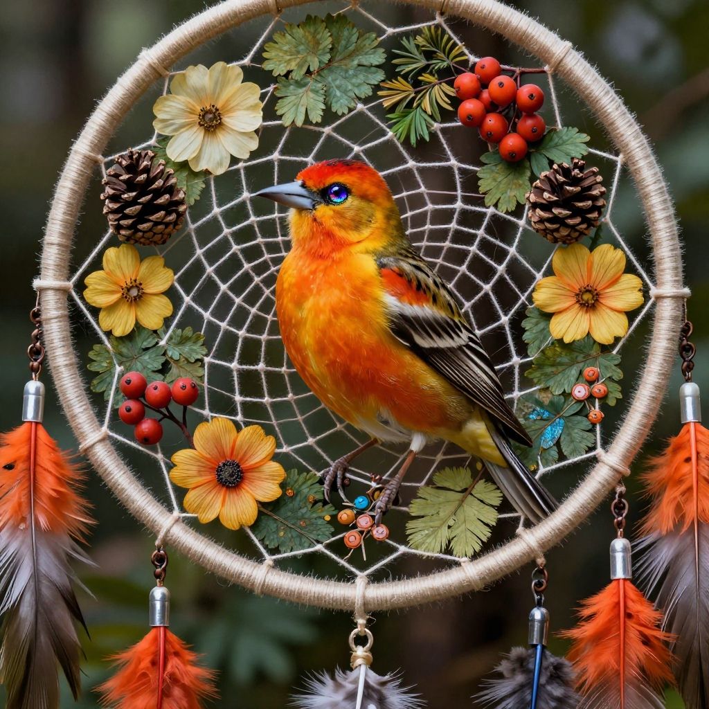 Very realistic photography, close-up of a dream catcher with a beautiful baltimore oriole in the center with shimmering piercing eyes, Digital masterpiece of the Leaf and Nature application, pressed flowers, feathers, complex forest background of cinematic hyperrealism, rowan berries, fantasy of pine cones, chiaroscuro, fantasy, triadic colors, storybook illustration, beautiful unusual details very detailed, masterpiece of small details, high quality, complex lighting, luminism, Miki Asai Macro photography, close-up, hyper detailed, trending on artstation, sharp focus, studio photo, intricate details, highly detailed, by greg rutkowski