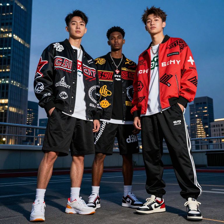Givenchy-inspired streetwear collection, bold patterns and logos on oversized jackets and sneakers, urban cityscape background at dusk, vibrant colors, dynamic composition