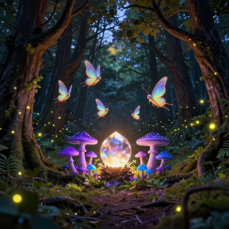 This is a digital illustration depicting a vibrant, magical garden scene. Clear, glowing crystal spikes are prominently featured in the center, emitting light and surrounded by lush green foliage and bright blue water lilies. Pink cherry blossom trees with delicate petals frame the top, casting a soft, dappled light. Sparkles and light reflections add a whimsical touch, enhancing the enchanting atmosphere. The colors are vivid, with contrasting blue flowers and pink blossoms set against green leaves and the glowing crystals. The image has a fantasy-like quality, with a serene, otherworldly ambiance.