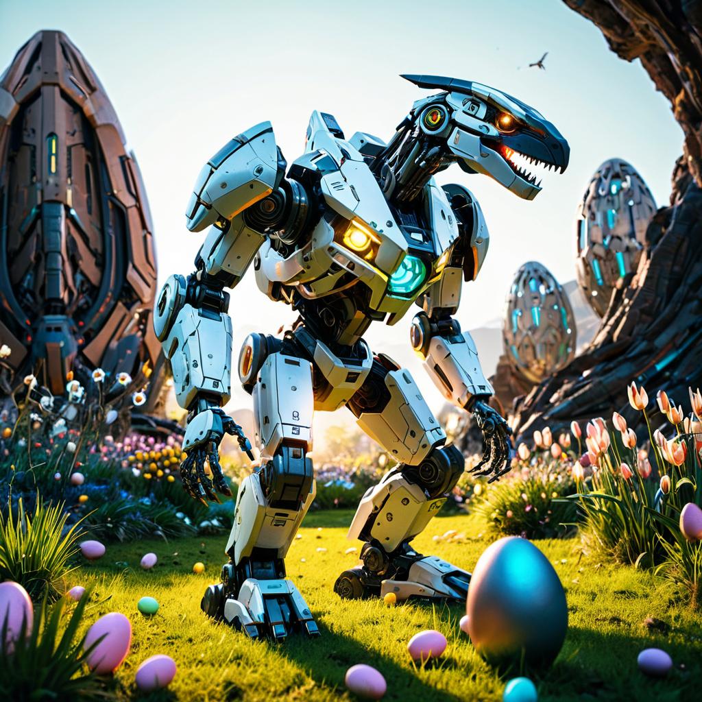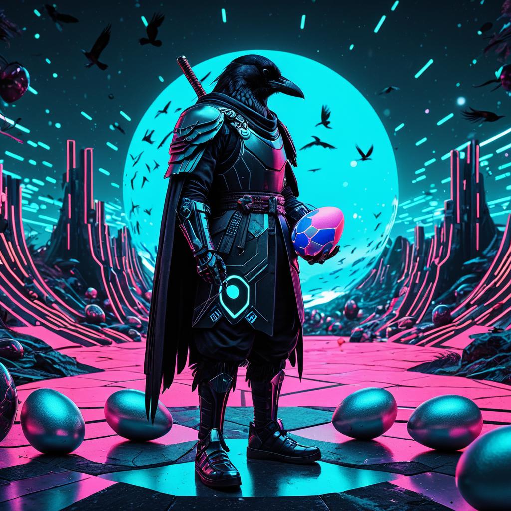 Desolate full body Cyber Samurai Crow holding a Luminescent Digital Egg in a futuristic landscape filled with neon reflections, acrylic glowing eggs, Easter time, outdoors, 8k, ray tracing, tone mapping, intricate details, highly detailed, visually pleasing intricate technological detailing, smooth textures, sharp aperture