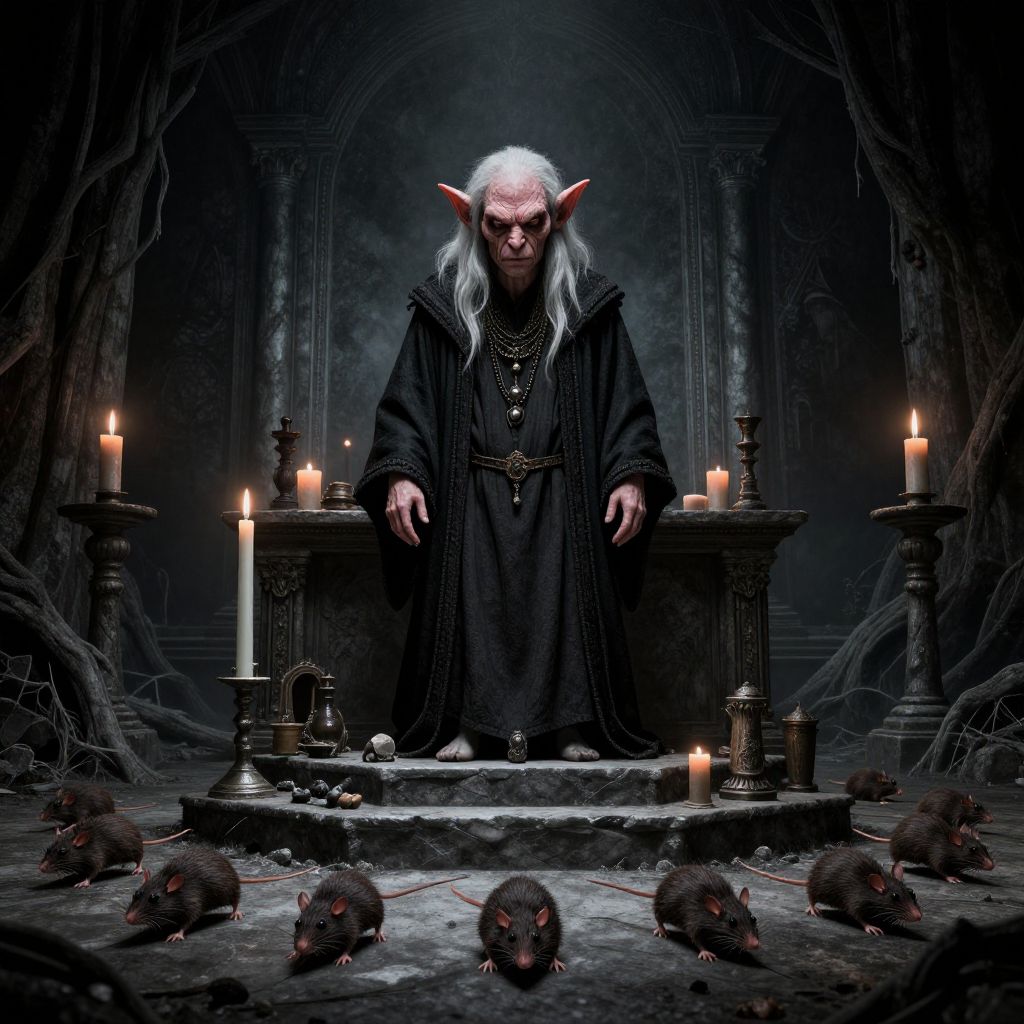 A digital illustration depicts a menacing, old, white-haired elf with pointed ears, wearing a black, tattered robe with intricate gold chains, standing in a dimly lit, dark, gothic-style chamber. The elf's wrinkled face and glowing red eyes are prominent. Surrounding the elf are eight black rats on the stone floor, and multiple lit candles on a raised altar and two side tables. The background features arched stone walls and twisted, gnarled roots. The scene is ominous, with shadows and light creating a dramatic, eerie atmosphere.