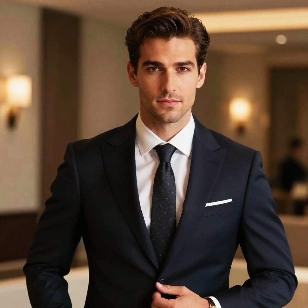 An artistic high-end photography featuring a suave man in professional attire, posing against a warm, ambient background that gives the photograph a luxurious and sophisticated vibe.