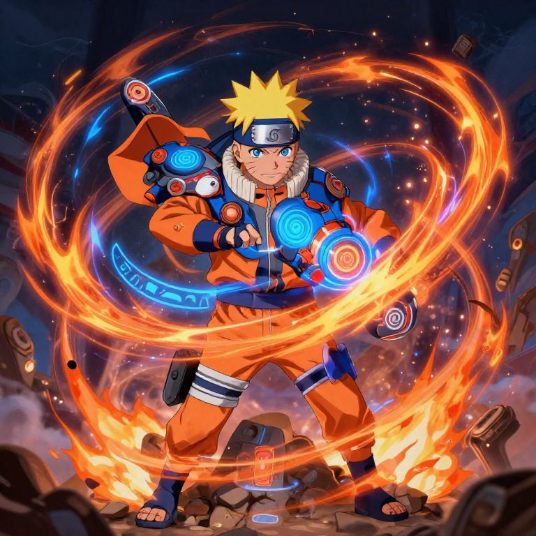 Anime-style digital artwork of Naruto, wearing orange ninja outfit, blue headband, wielding glowing blue and orange energy rings, standing amidst fiery destruction.
