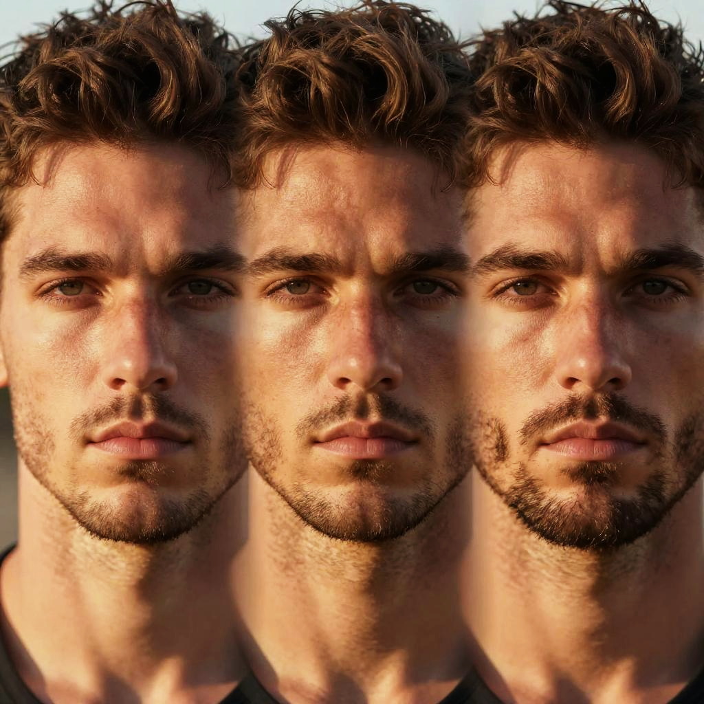 Photograph of a Caucasian man with a light skin tone, brown wavy hair, and a trimmed beard, shown in a triptych format. His expression is neutral and serious, with slightly furrowed brows and a slight shadow on his face. He has blue eyes and is wearing a dark-colored shirt. The lighting is natural, highlighting the texture of his skin and hair. The background is blurred and indistinct, focusing attention on the man's face. The image has a realistic, high-definition style with sharp details and warm tones.