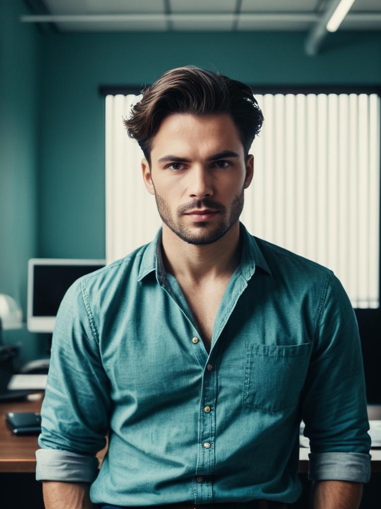 Man in Casual Office Outfit, photorealistic professional portrait, cinematic realism --sref 1387