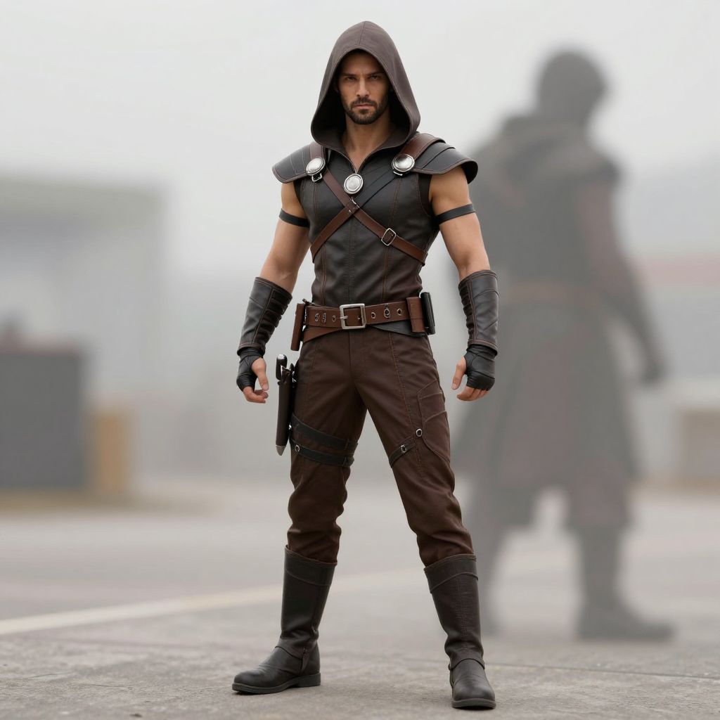 Photograph of a muscular, bearded man in dark hooded leather armor, brown pants, and black boots, standing confidently on a foggy street