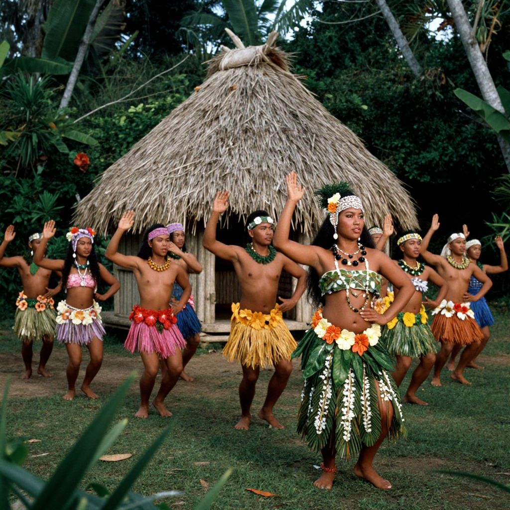 Photograph of seven Polynesian dancers, six women and one man, performing around a thatched hut in a lush, tropical forest. They wear colorful, grass-skirted hula dresses with flower headpieces, and various necklaces. The central woman holds a large, conical straw hat above her head. The dancers have dark skin and are bare-chested or wear minimal tops. Their skirts are in vibrant shades of red, orange, yellow, green, and blue. The background features dense greenery with tall palm trees. The dancers are mid-dance, with arms raised and legs bent, creating a dynamic, lively scene.