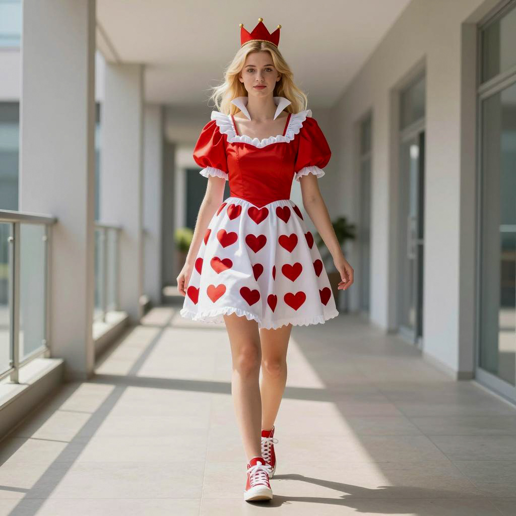 Queen hearts costume female, photograph of a young woman walking in a hallway, wearing a red and white heart-patterned dress, puffy red sleeves, white ruffled collar, red crown, red sneakers, long blonde hair, bright natural light, modern architectural background, full body shot, confident expression, fashion model, whimsical, fairy tale-inspired outfit, sunlight casting shadows, hallway perspective, daytime, indoor setting