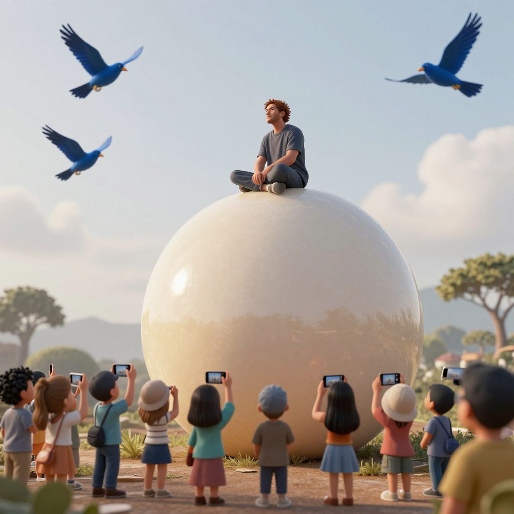 A man sits atop a large, glistening egg-shaped object as a crowd of tiny worshippers look up at him, taking photos with their phones, while blue birds soar through the sky.