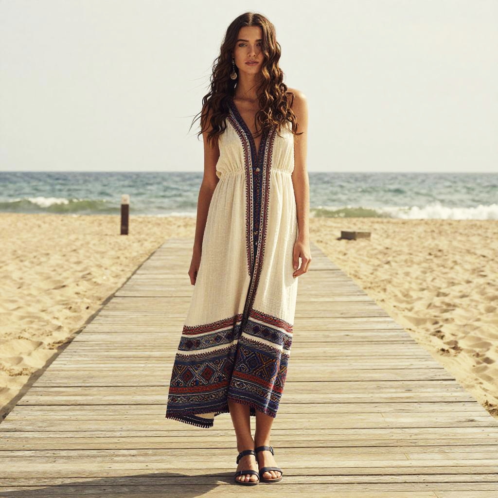 540 Waves hairstyle on woman, wearing bohemian dress and sandals, in beach boardwalk, captured in fashion editorial style with soft morning light.