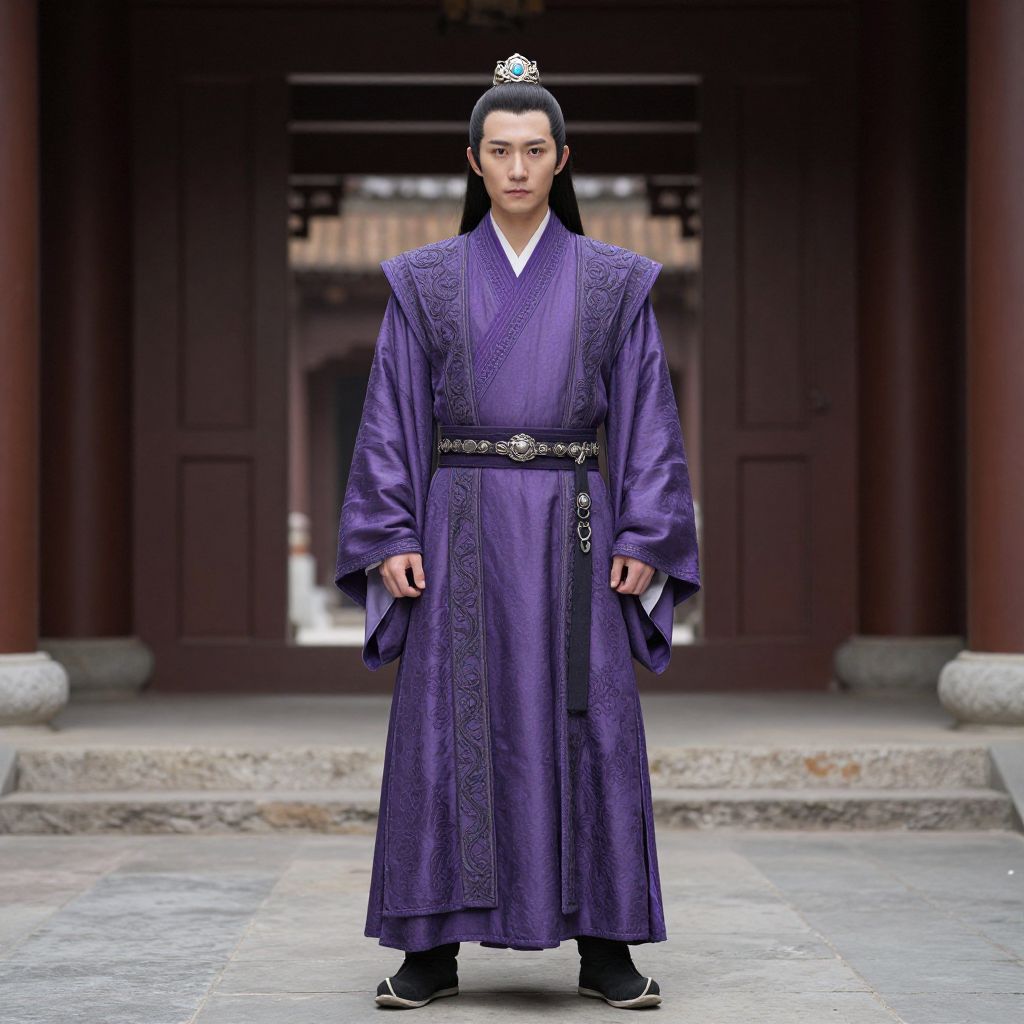 Photograph of a male model in traditional Korean royal attire: purple silk robe with black belt, white collar, silver crown, standing in front of a