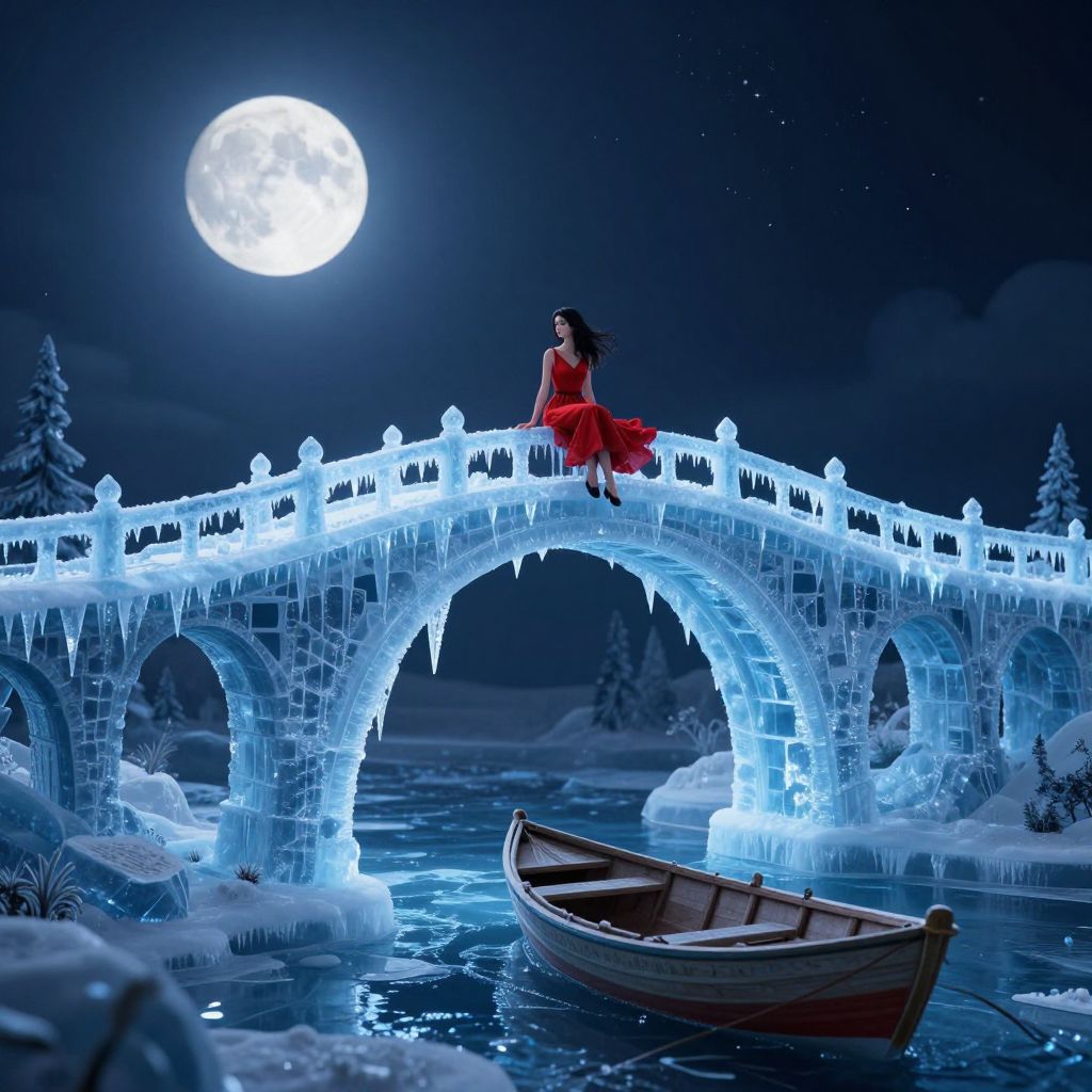 Digital artwork of a woman in a red dress sitting on a glowing, icy bridge at night, with a full moon, boat, and snow-covered trees