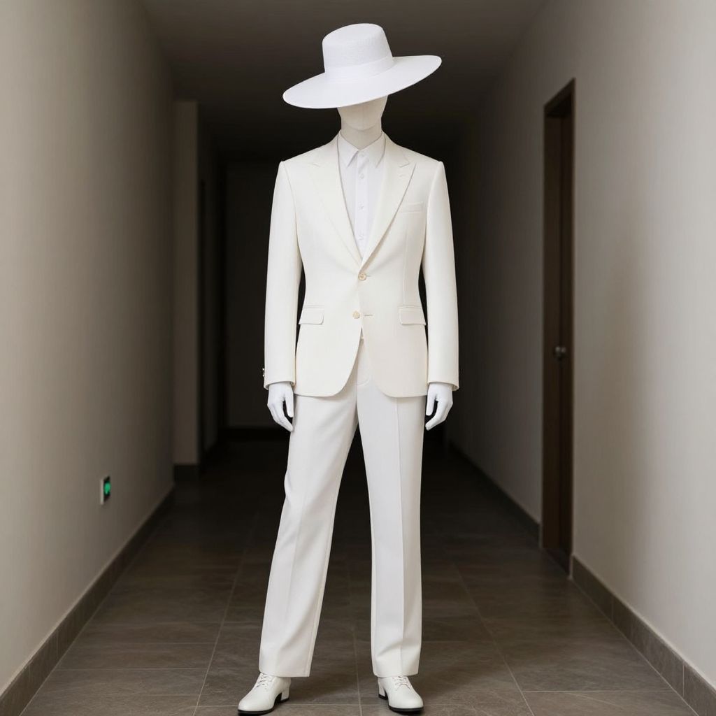 This digital CGI image features a faceless, white mannequin standing in a dimly lit, narrow hallway. The mannequin wears a sharp, white suit with a single-breasted jacket and matching trousers, complemented by a wide-brimmed white hat and white shoes. The suit's texture appears smooth and slightly reflective. The hallway has dark brown tiled floors and white walls, with a single closed door on the right side. The lighting creates a stark contrast between the bright mannequin and the shadowy background, adding a mysterious, almost surreal atmosphere to the image.