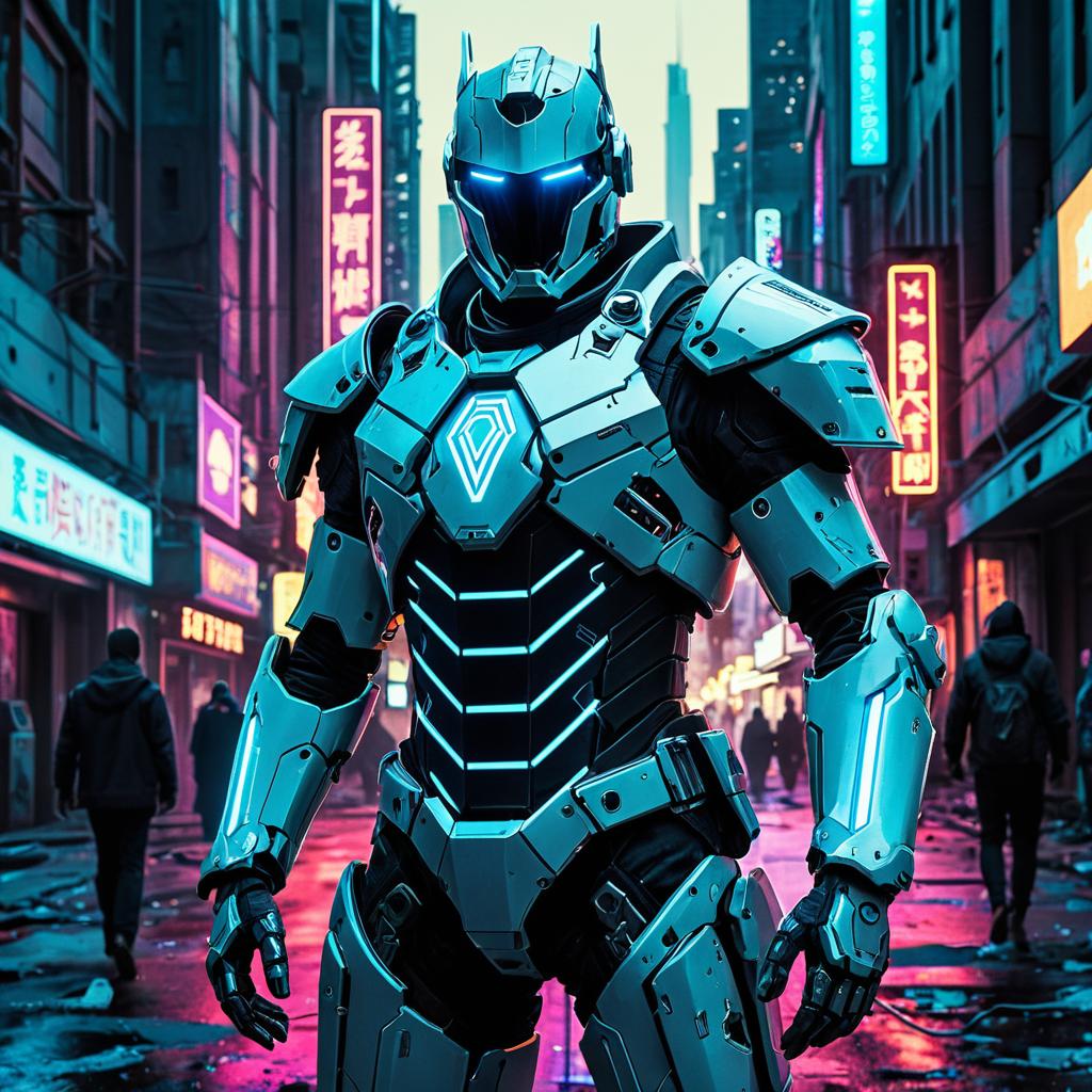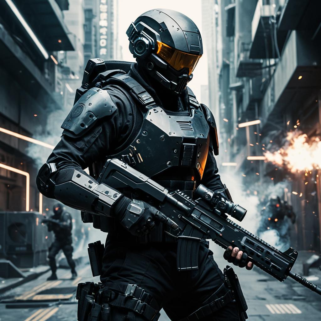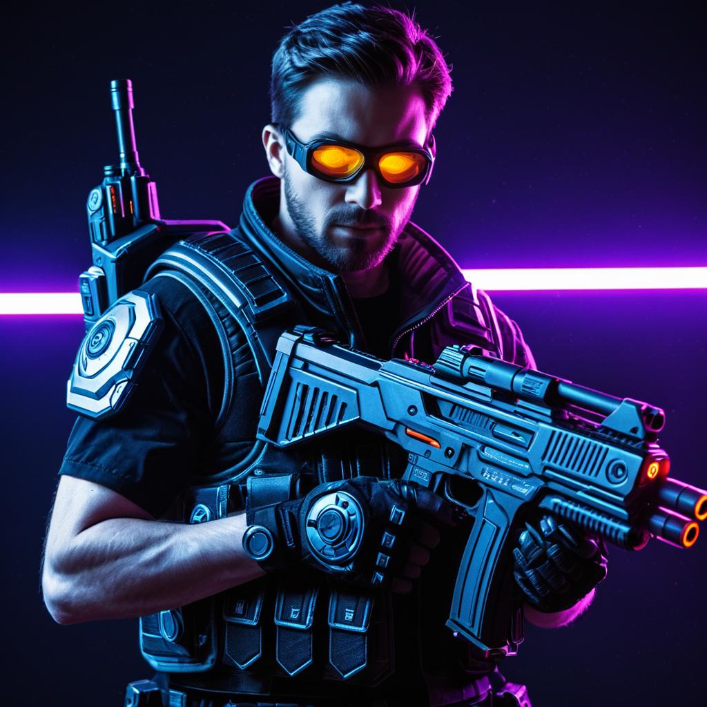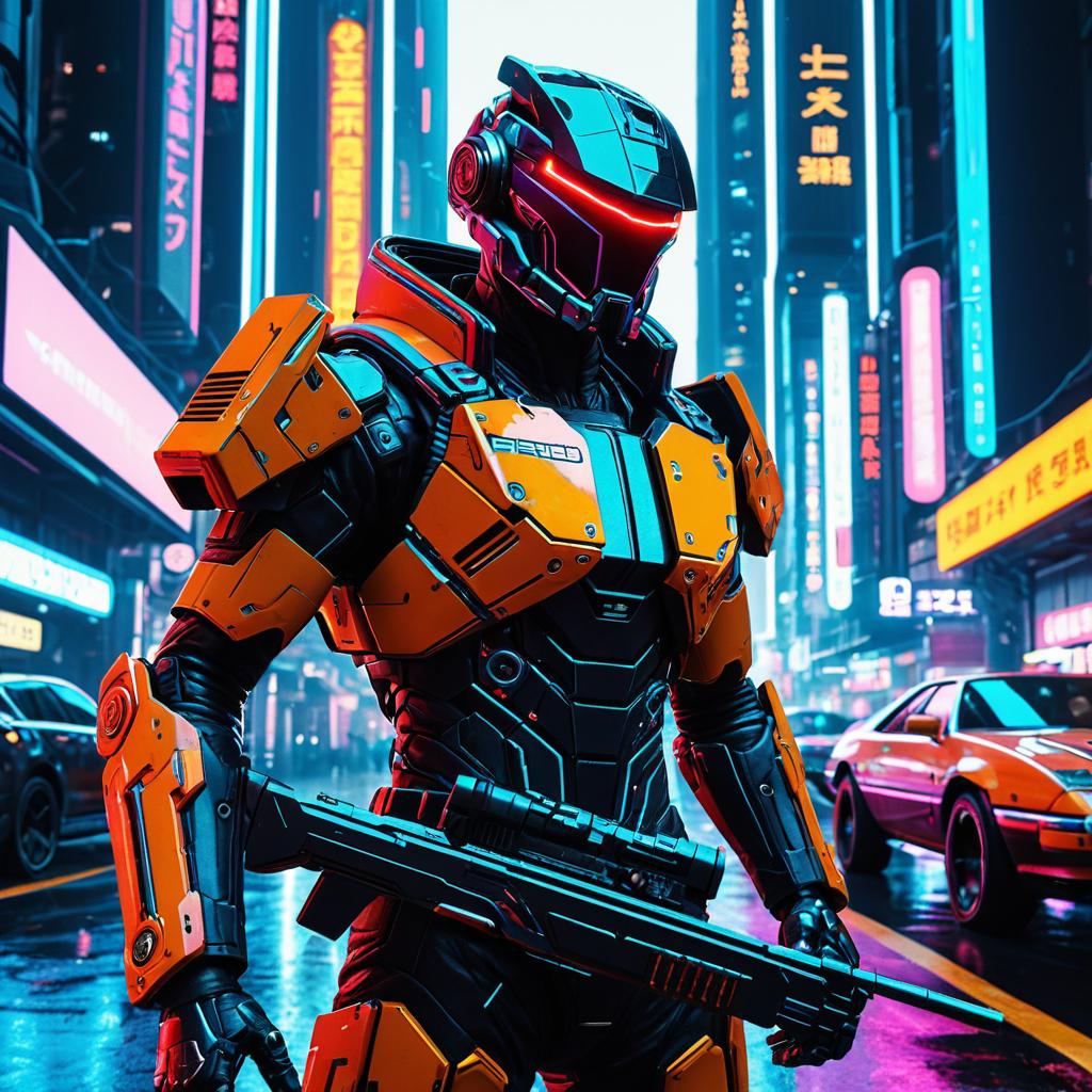 Futuristic Male Cyborg Mercenary on Rainy Rooftop