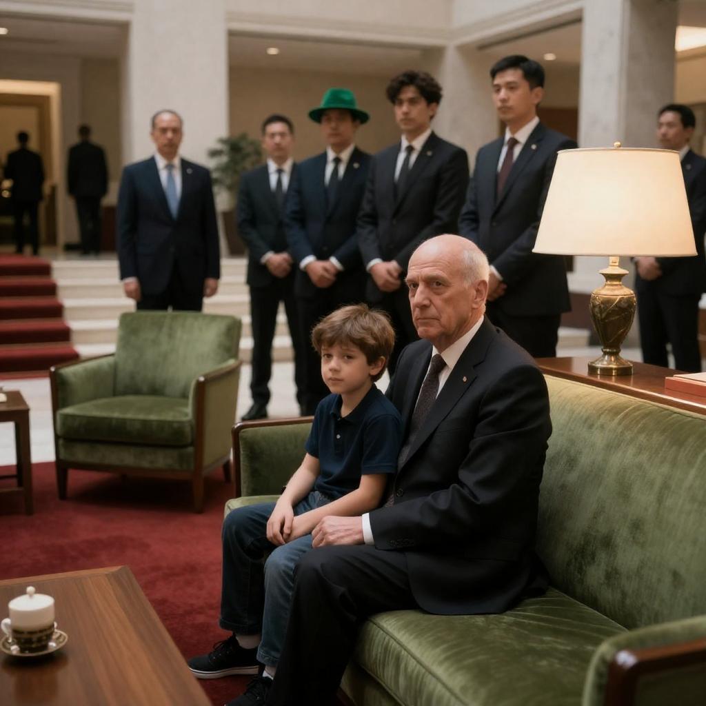 Photograph of a lobby scene. Older bald man in black suit holding a young boy sits on a green couch. Background: group of men in dark suits standing near stairs, one in green hat. Marble columns, large lamp, sign on steps. Red carpet, green armchairs, wooden coffee table with lamp. Intense expressions on men's faces. Multiple people, formal attire.