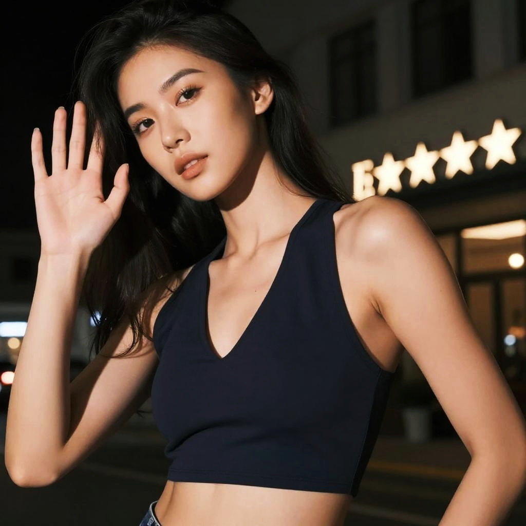 Woman posing for a photo, (wearing crop_top_clothing, wearing deep_v-neck_dress:1.3), good hand, 4k, high-res, masterpiece, best quality, head:1.3, ((Hasselblad photography)), finely detailed skin, sharp focus, (cinematic lighting), collarbone, night, soft lighting, dynamic angle, [:(detailed face:1.2):0.2], (((5 stars hotel))), outside