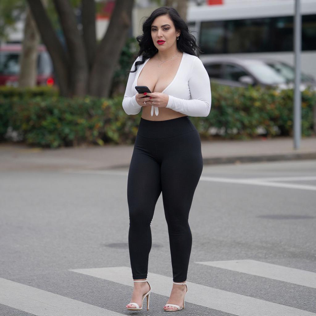 Photograph of a curvy woman with long brown hair, wearing a white long-sleeve crop top and black sheer leggings, standing outdoors by a tree. She poses with one hand on the tree and the other touching her hair, wearing white high-heeled sandals. Background includes blurred greenery and parked cars.