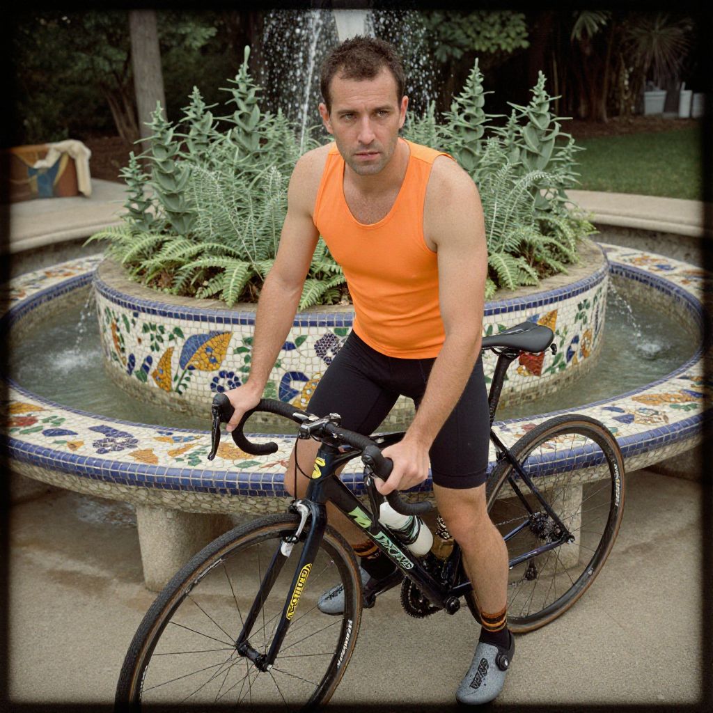 Photograph of a fit, Caucasian man with short brown hair, wearing a bright orange sleeveless tank top and black cycling shorts, riding a black road bike. He is positioned in front of a circular, mosaic-tiled fountain with water cascading down, surrounded by green ferns. The background includes a blurred garden and a beige bench. The man's expression is focused, and he is gripping the bike's handlebars with both hands. The image has a slight vignette effect, emphasizing the subject.