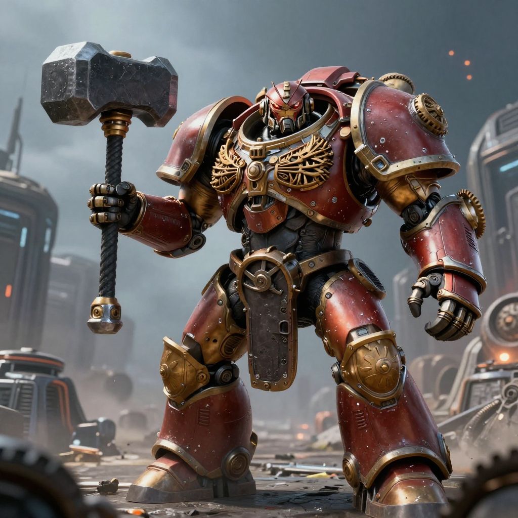 Battle-ready warforged colossus clutching a massive hammer, gears and pistons visible beneath its armored plating, futuristic warzone background, dynamic pose, high detail