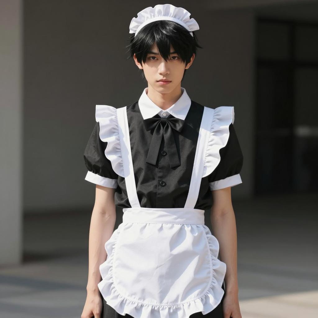 Photograph of a young boy with short brown hair and fair skin standing on a sunny sidewalk wearing a traditional white French maid outfit featuring frilled shoulders, a black necktie, and a lace headband. The boy has a slight blush on his cheeks and stands with arms crossed. The background includes blurred green grass, trees, and brick buildings in bright natural daylight.