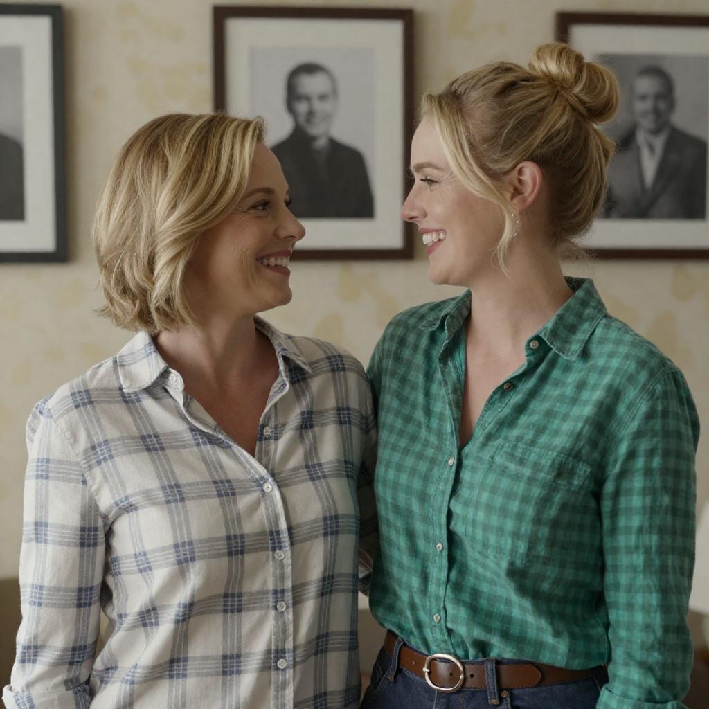 Black-and-white photograph of two women in plaid shirts, smiling at each other. Woman on left has short, wavy hair; woman on right has blonde hair in a bun. Both wear button-up shirts. Background includes a framed picture of a house with a hat. Women stand close, facing each other, with soft, friendly expressions.