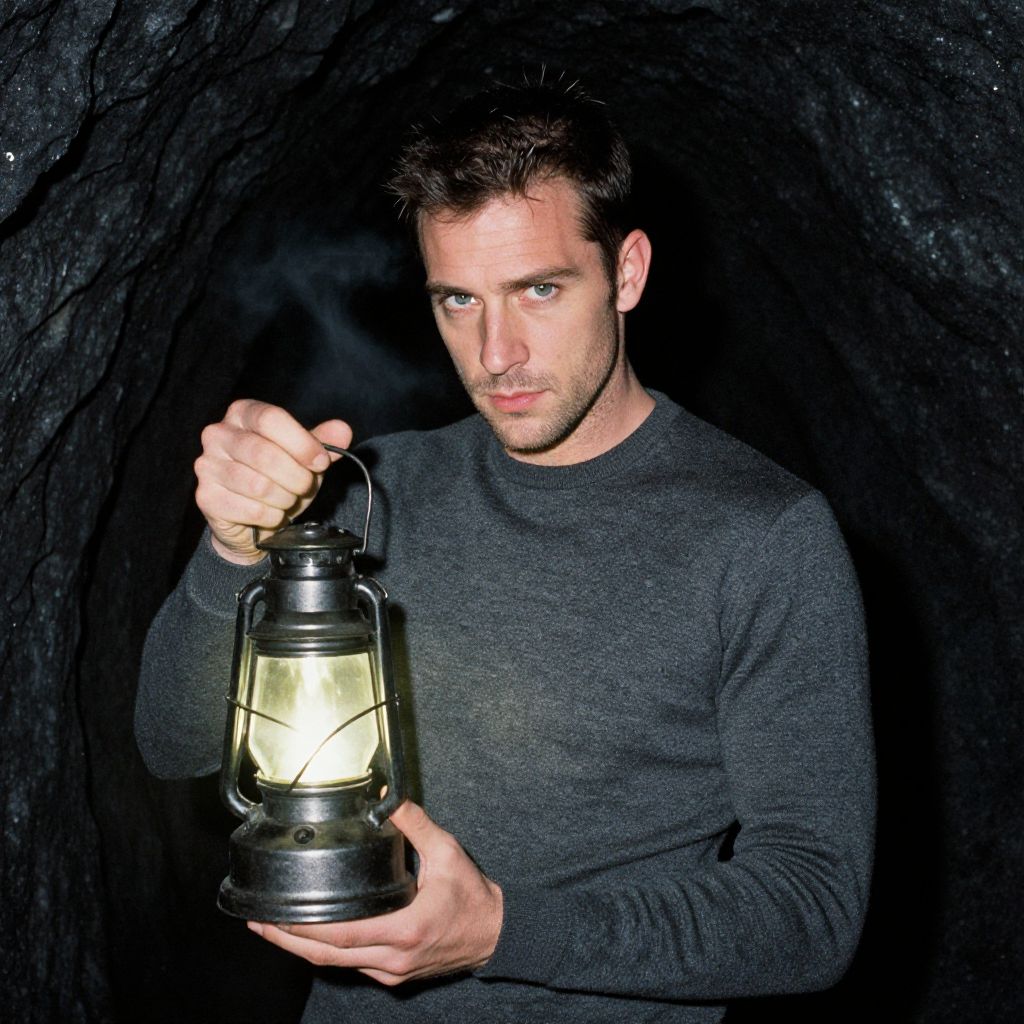 Photograph of a white man with short dark brown hair and blue eyes, standing in a dark, cave-like background. He wears a fitted, long-sleeve, dark gray sweater and holds a black, metal lantern with a glowing yellow light. His expression is serious and focused, with a slight frown. The black cave walls are textured and shadowy, creating a stark contrast to the bright lantern light. The man's hands grip the lantern handle tightly, and his stance is slightly forward, emphasizing the illumination from the lantern. The image has a high-contrast, dramatic effect.