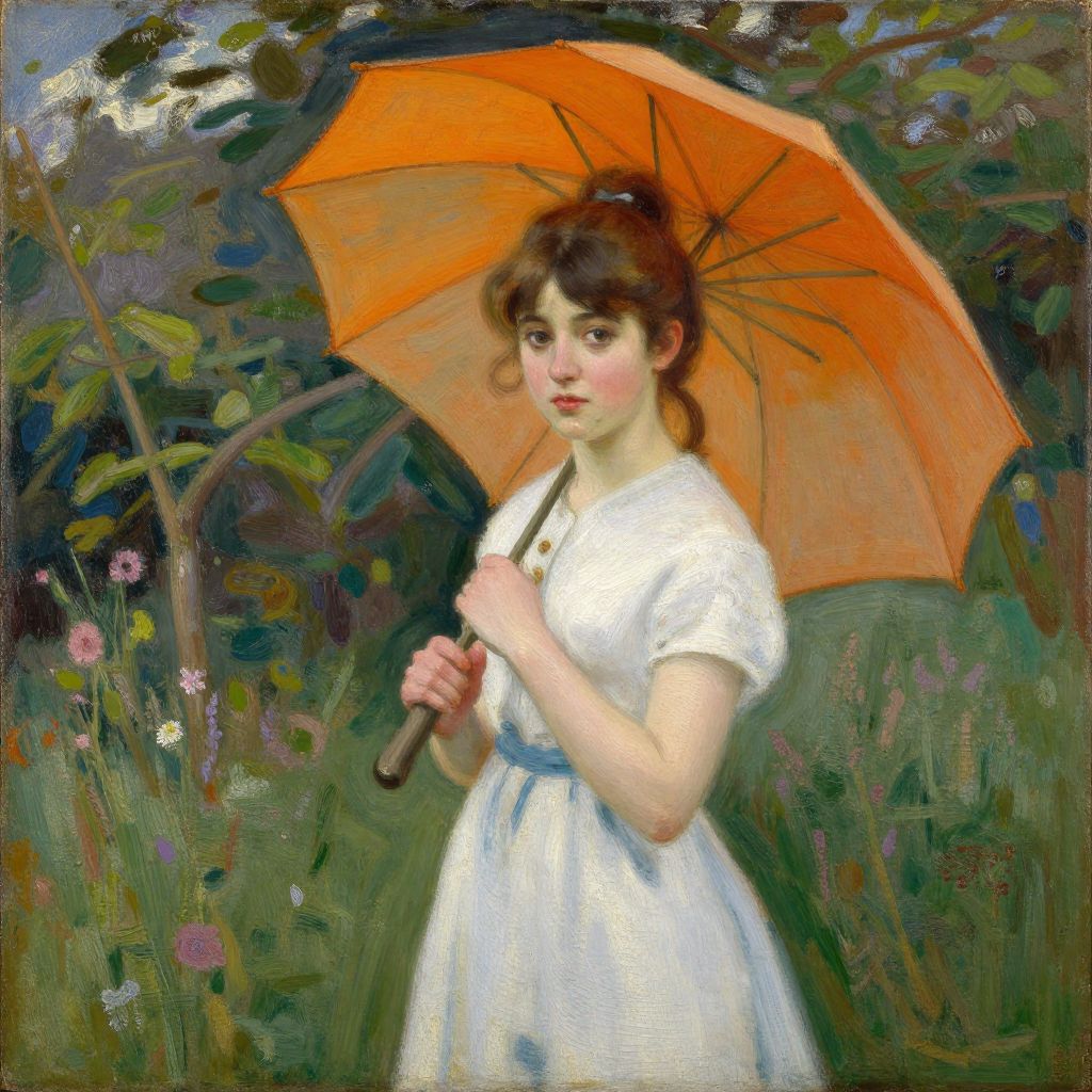 Impressionist painting of a young woman with pale skin, brown hair in a bun, wearing a white dress and holding an orange umbrella, standing in