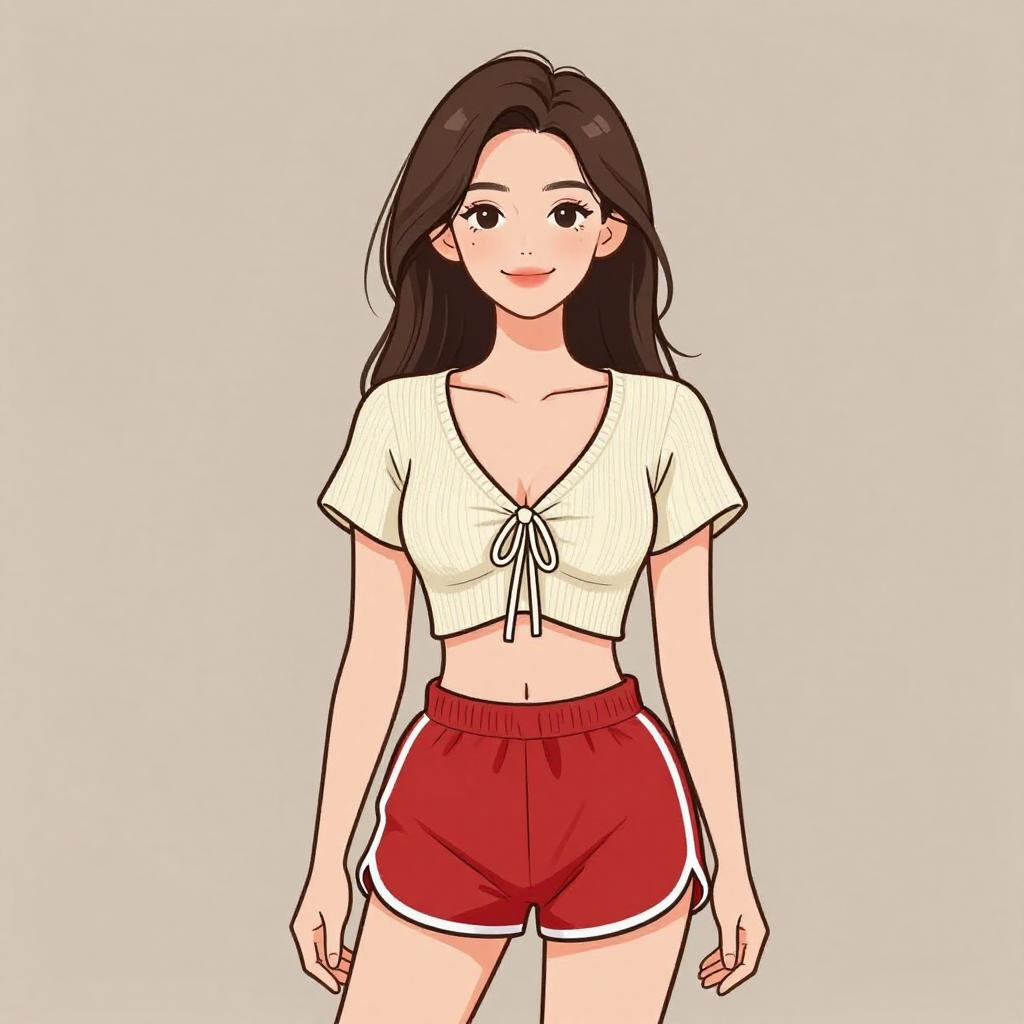 Anime-style digital drawing of a cute, smiling young woman with dark brown hair, wearing a black tied crop top and navy blue shorts with white trim,