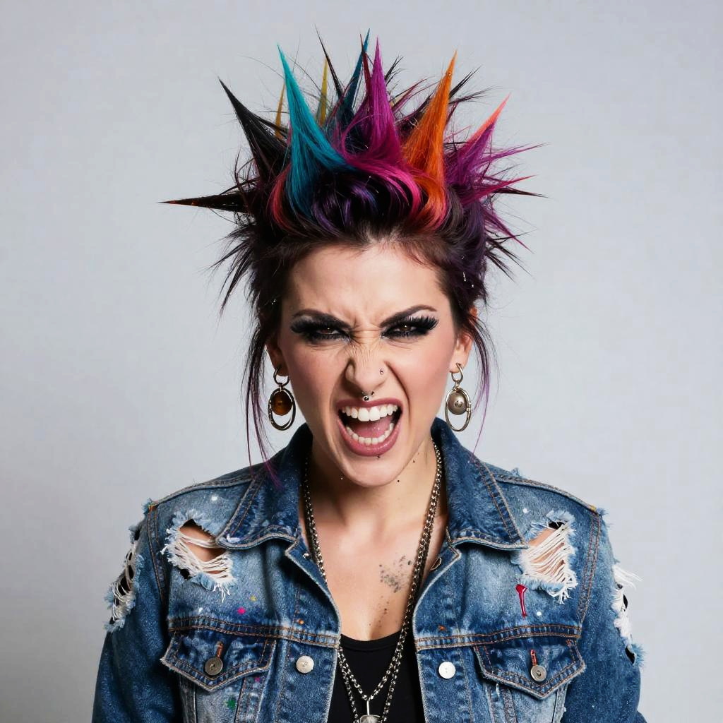 Punk artstyle portrait of a fierce woman with colorful spiked hair, heavy eyeliner, piercings, wearing a distressed denim jacket, dripping paint effects, chaotic and raw energy