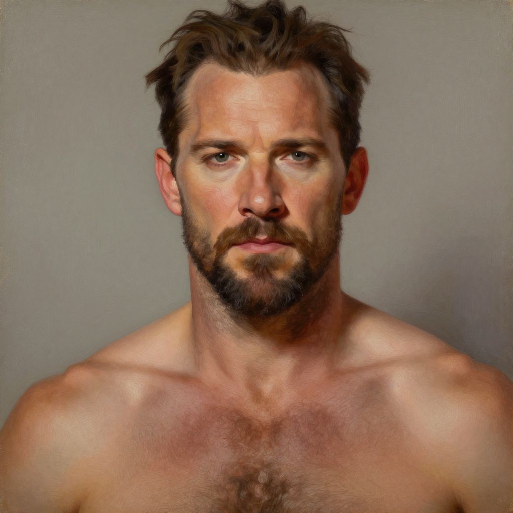 Artistic rendering of a bearded man with Henry Cavill's facial structure and prominent chest hair, soft ambient lighting, subdued color palette, oil painting style, powerful and confident expression